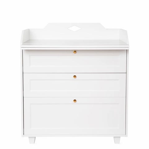 Cam Cam Copenhagen puslekommode i hvid. Kommoden har to låger med gitterdetaljer og indvendige hylder til opbevaring af bleer, tøj og tilbehør. Øverst er der en pusleplads med kant, hvor der kan placeres en puslepude. Velegnet til brug på børneværelset som kombineret pusleplads og opbevaringsmøbel.