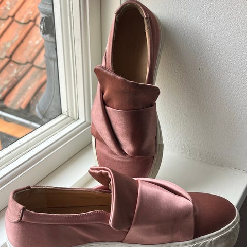 Billi Bi Loafers - ruskind, varm mørke-gule med guldlænke, kun prøvegået indenfor, har bare stået, så har glemt størrelsen, men formentlig 38-39, selve sålen måler 26,5 cm.