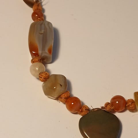 Halskæden består af uregelmæssigt formede perler i turkis nuance, samlet på snor med metal-lås.