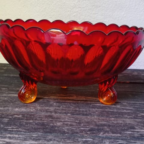 Glas, Rubinrød skål på 3 gule fødder, Fyens Glasværk
