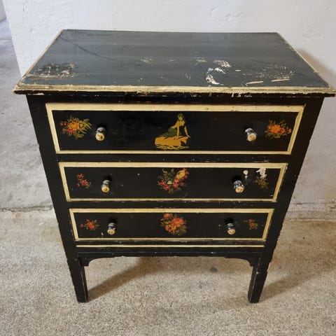 Kommode designet som en klassisk dampskibskuffert. Fire skuffer med læderagtige trækgreb og metalholdere i antik messing, trædetaljer langs kanterne og solide hjørnebeskyttere. Giver et varmt og nostalgisk udtryk – perfekt som blickfang i stue, entre eller soveværelse. Møblet har brugsspor svarende til stilen og alderen, hvilket kun bidrager til det autentiske vintage-look ;)