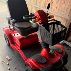 El-scooter med 4 hjul i sølvfarve. Modellen har sort, polstret førersæde med armlæn og høj ryg, for- og bagkurv til opbevaring samt fodplade i fuld længde. Scooteren er udstyret med lygter for og bag, spejl og brede dæk, som giver stabil kørsel på faste underlag. Velegnet som hjælpemiddel til persontransport over kortere afstande på fortov og lignende underlag.