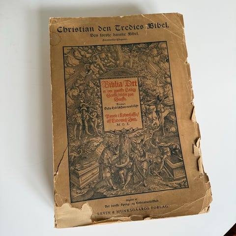 Facsimileudgave af Christian III’s Bibel fra 1550 – den første komplette bibel på dansk. Udgivet i 1928 af Det danske Sprog- og Litteraturselskab i samarbejde med Levin & Munksgaards Forlag som en tro gengivelse af originaludgaven fra reformationstiden.