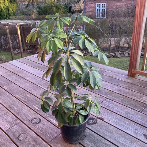 Schefflera stueplante med grønne, håndformede blade. Planten står i en potte og har flettet stamme, hvilket giver et træagtigt udtryk. Egnet som indendørs stueplante i lyse rum uden direkte, stærk sol. Kan placeres alene eller sammen med andre potteplanter som del af en grøn indretning.