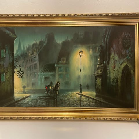 L. Levison Junr. maleri med motiv af hestevogn i bymiljø. Billedet viser en hestevogn med flere heste foran en bygning og gadescene i baggrunden. Maleriet er monteret i en sortmalet træramme med ophængssnor bagpå. Velegnet som vægdekoration i stue, gang eller kontor, hvor man ønsker et klassisk bymotiv med historisk præg.