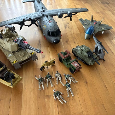 Legetøj militær sæt med forskellige køretøjer, fly, helikoptere, skibe og soldaterfigurer. Sættet omfatter større militærfly, kamphelikoptere, patruljebåd og forskellige militærkøretøjer samt tilbehør som våben og smådele. De medfølgende figurer er bevægelige og kan placeres i køretøjerne. Egnet som samlesæt eller til rolleleg med militærtema. Leveres samlet som vist på billederne.