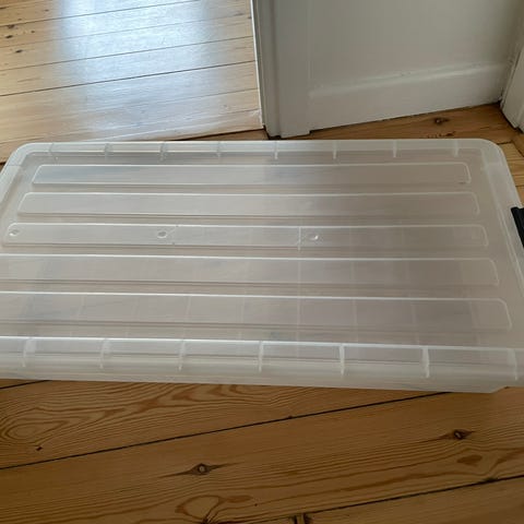 Boks til opbevaring, 39 x 39 cm. Højde 27 cm. Med hjul og låg.