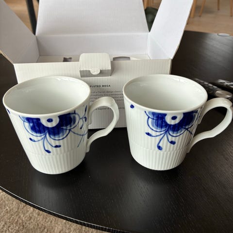 Royal Copenhagen Blue Fluted Mega krus i hvidt porcelæn med blå dekoration. Sættet består af to krus med hank. Dekorationen er den karakteristiske Blue Fluted Mega med forstørrede blå blomster- og rankemotiver på riflet hvid bund. Velegnet til varme drikke som kaffe, te eller kakao. Krusene er en del af Royal Copenhagens Blue Fluted Mega stel og kan kombineres med andre dele fra samme serie.