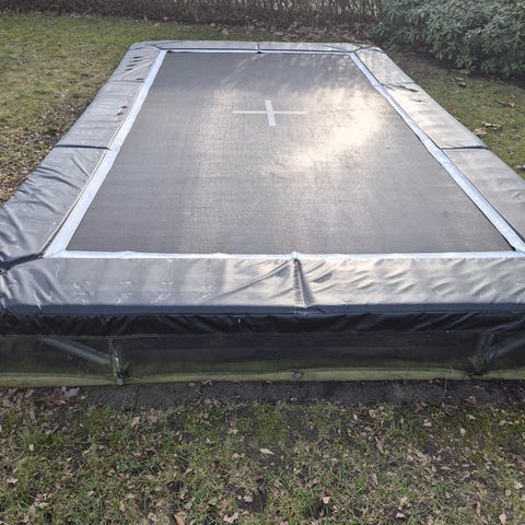 Stor trampolin Jumpking Rectangular Pro 4,7 x 3,6 m til træning af springgymnastik med springareal 16 m2 i god stand inkl net og stormsikring. Der er et lille hul i nettet (ca 10 cm i diameter). Nypris 7600, kvittering haves. Køber klarer nedtagning.