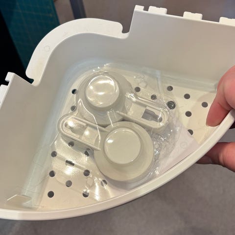 En smart trådkurv med kroge du hænger på blandingsbatteriet.