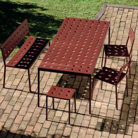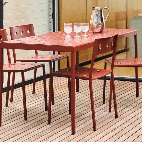 Rektangulært havebord i metal med gennemgående hulmønster i bordpladen. Bordet har slanke, lige ben og en glat overflade, der er velegnet til udendørs brug på terrasse, altan eller i haven. Designet gør det muligt at kombinere bordet med forskellige typer havestole eller bænke i lignende stil. Bordet er egnet som spisebord udendørs og giver plads til flere personer omkring bordpladen. HAY Balcony havebord – Sprit nyt