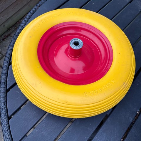 Jeg sælger min trillebøre med punkterfri hjul. Den har et lille hul, som vist på billedet.