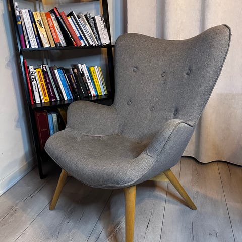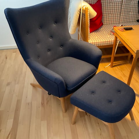 Kare Design lænestol i lys grå stofpolstring med knapdetaljer i ryglænet. Stolen har buede armlæn og højt ryglæn, der giver støtte til ryg og sider. Benene er udført i træ med skrå, let udadgående form. Egnet som læse- eller loungestol i stue, soveværelse eller andre opholdsrum.
