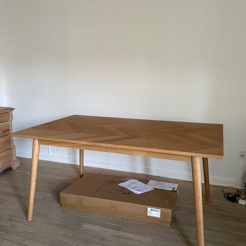 Bordet er 160 cm langt, ca 95 cm bredt. Ben skal efterspændes.