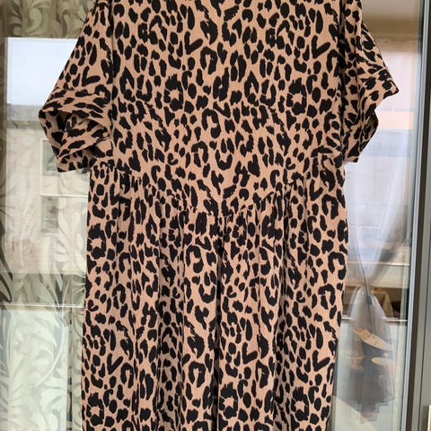 Korte ærmer, v-hals og syet med drapering rundt i taljen.