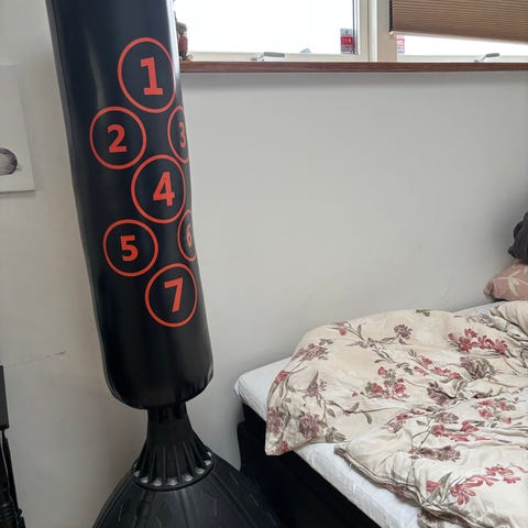 Fritstående bokse- og sparkesæk med markeringsfelter i sort med røde tal. Sækken står på en fod, som kan fyldes for at give stabilitet under træning. Egnet til boksetræning, kickboxing og konditionstræning derhjemme. Markeringsfelterne kan bruges til at øve præcision og forskellige slag- og sparkekombinationer.