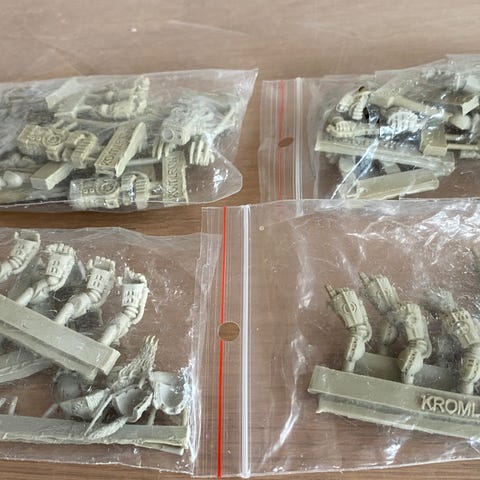 Miniature figurdele i plast i flere separate poser. Delene fremstår som u samlede komponenter, der kan bruges til at samle figurer eller modeller. Egnet til hobbyprojekter, modelbyggeri eller rollespilsrelaterede miniaturer, hvor man selv ønsker at samle og eventuelt male figurerne.
