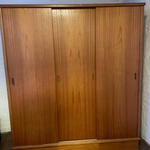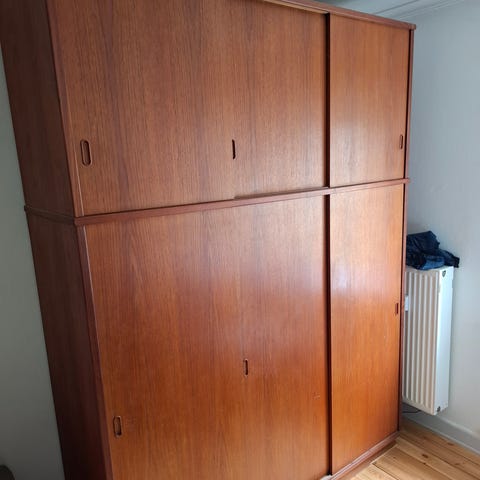 Smukt garderobe skab i teak træ fra 1960/1970’erne - god kvalitet med hylder, skuffer og monteret garderobestang til at hænge tøj