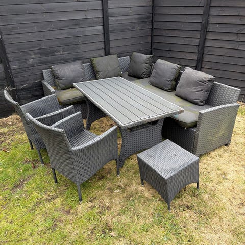 Hjørnesofasæt til haven bestående af en hjørnesofa og et rektangulært bord. Hynderne medfølger.