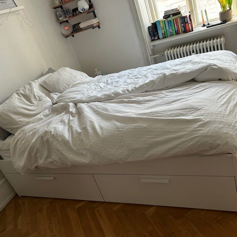 IKEA Brimnes seng med 4 skuffer til opbevaring. Pænt brugt. Madrassen har nogle pletter og følger med gratis. Sengen skal selv tages ned.