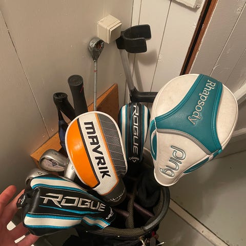 Blandt andet en helt ny Callaway hybrid. Kvalitetssæt med tasken fyldt godt op med bolde.