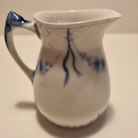 Porcelæn kaffekande i klassisk hvid med blå dekoration. Kanden har låg med knop, buet hank og lang hældetud. Indvendigt er der glat, glasureret overflade. Velegnet til servering af kaffe eller te ved bordet. 1.sort