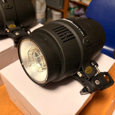 Taske med 2 stativer og blitzen med lys, trådløs og med ledninger, kan udløses via andet blitzlys, med lysmåler antik model uden batteri.