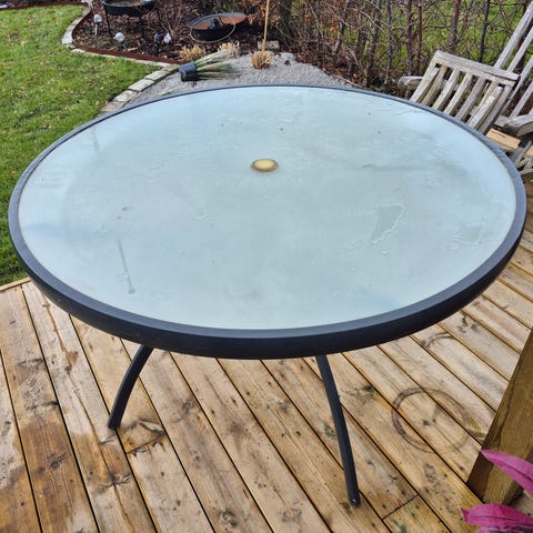 Rundt havebord med tilhørende stole i grå metal. Sættet er egnet til altan eller terrasse og består af et rundt bord og matchende stole. Oprindelige pris 749kr.