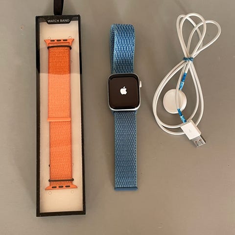 Apple Watch smartwatch med gråt sportsrem. Uret har rektangulær touchskærm og bagside med sensorer til måling af aktivitet og pulsrelaterede data. Remmen er i stoflignende materiale med justerbar lukning, egnet til daglig brug. Uret er designet til brug sammen med iPhone og kan vise beskeder, notifikationer og andre funktioner direkte på håndleddet.holder til en helt dag, er afinstalleret, derfor kendes batteri tilstand desværre ikke, fejler intet