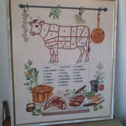 Broderi med portræt af person i profil iført rød hætte eller slør. Broderiet er monteret i en rektangulær ramme med gylden kant. Baggrunden er mørk, hvilket fremhæver motivets røde og beige nuancer. Velegnet som vægdekoration i stue, gang eller andre opholdsrum.