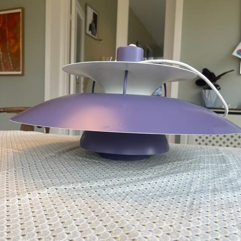 Gammel PH5 loftlampe i hvid, orange og lilla. Fremstår i pæn stand uden buer og ridser. Mindre skævhed i øverste skærm, men ikke umiddelbart tydelig.