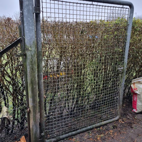 Gitterlåge i metal med kraftig ramme og trådnet. Lågen har beslag og lukketøj monteret på siden, samt nederste beslag til montering i gulv eller sokkel. Egnet til brug i stald, lade, indhegning eller andre områder, hvor der er behov for en robust afskærmning med gennemkig gennem gitteret.