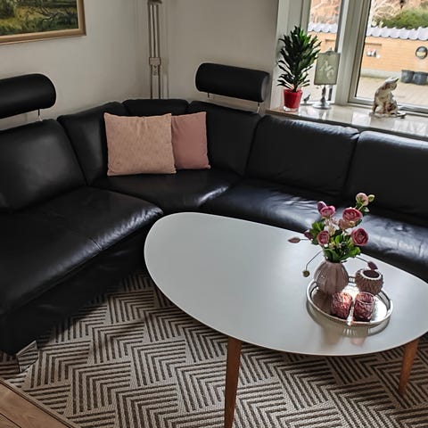 Sofaen fremstår generelt pæn med almindelige brugsspor i læderet. Der er et lille mærke i chaiselongen (se billede). Ellers en solid og god sofa med god siddekomfort.
