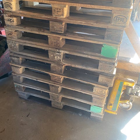 Standard europaller i træ, velegnede til opbevaring og transport af gods. Mål ca. 120 x 80 cm pr. palle. Flere paller stablet på hinanden, egnet til brug i lager, værksted eller lignende.