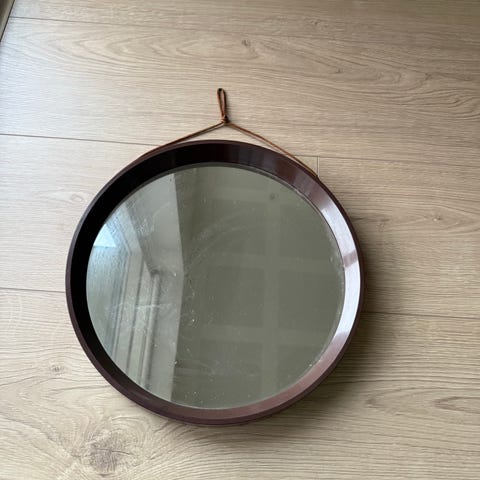 Rundt spejl med orange ramme.