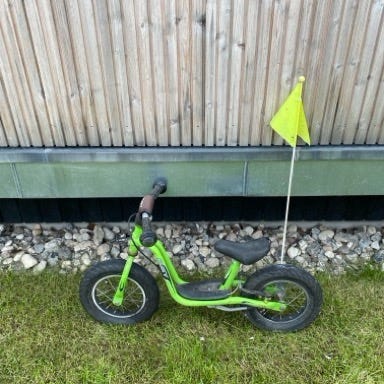Happy Rider løbecykel med 12" hjul. Cyklen er blå med gule fælge og gule håndtag samt sort saddel. Egnet som løbecykel til mindre børn, der skal øve balance og styreteknik. Velegnet til brug på faste underlag som fx fortov og gårdmiljø.