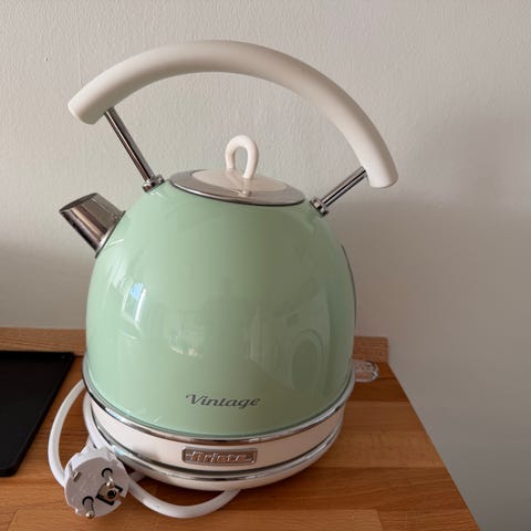 Den er brugt, men løbende afkalket og i øvrigt kun brugt med afkalket vand, så i super fin stand. Basen har temperatur styrring hvilket gør den perfekt til pour over kaffe og te.