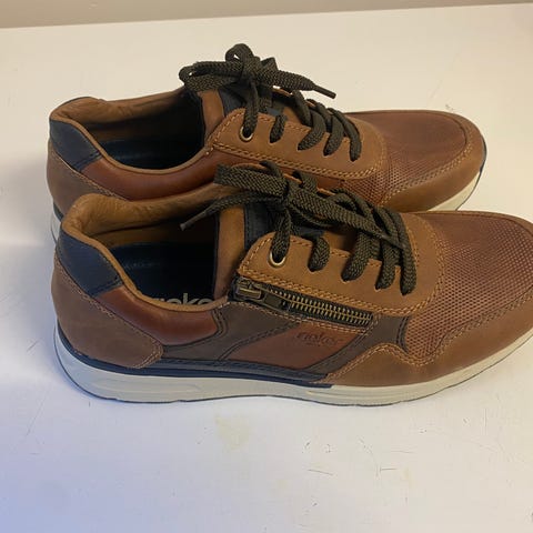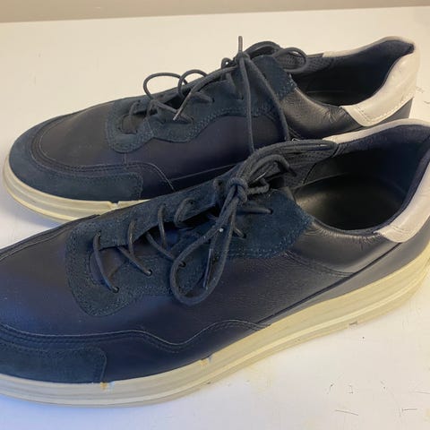 Ecco herresko/sneakers i str. 45. Modellen er i mørkeblå med lys sål og hvid hælkappe. Overdelen fremstår i glat og let nubuck-lignende materiale med snørelukning. Skoene har gummisål med Ecco-logo under bunden. Velegnet som hverdagssko.