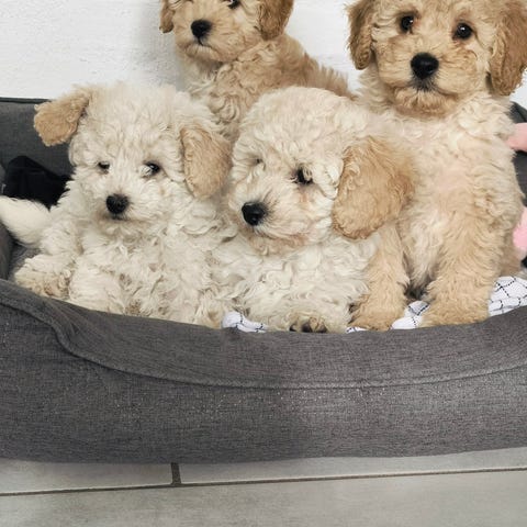 Vi er 5 søde hvalpe som om 4 uger søger en ny madmor. Vi er to piger og 2 drenge. Vi bliver chippet sundhedstjekket og stambog