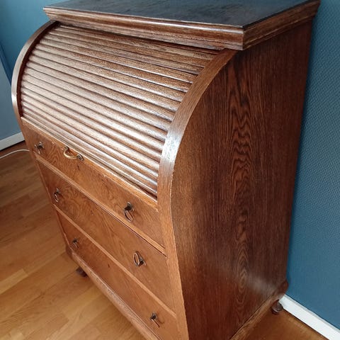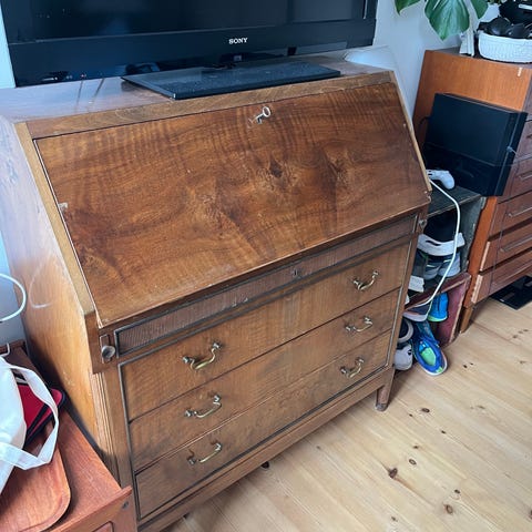Brugt chatol med skriveklap. Malet hvidt for +15 år siden. Brugt på teenageværelset som skrivebord. God plads med tre rummelige skuffer og fire mindre skuffer for oven.