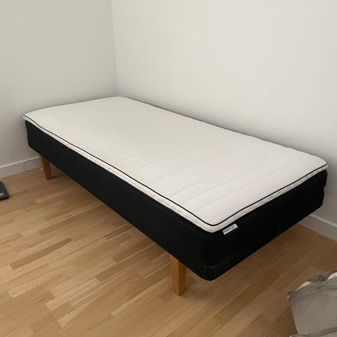 Springmadras og seng 90 x 200, med plads til opbevaring under sengen.
