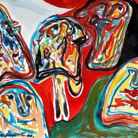 Klassisk komposition af Finn Pedersen. Olie på papir. Abstrakt cobra billede.