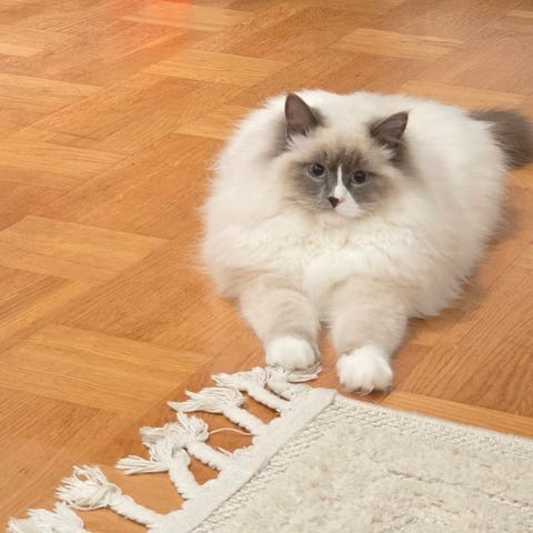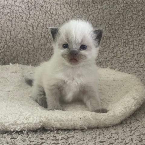 Vi har haft Gandalf siden han blev født den 5. maj 2019. Hans mor bor stadig hos os og er en blanding af hellig birma, ragdoll og norsk skovkat. Faren er ukendt, men der boede flere colourpoint/siameser-blandinger i området.