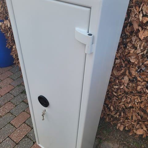 Sikkerhedskab med en dobbelt-karm nøglelås og har en 2 hylder til opbevaring af værdier eller andet.