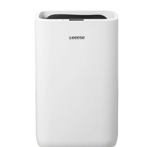 Eeese Hugo affugter i hvid. Enheden har digitalt display og betjeningspanel på toppen med flere funktionsknapper, herunder blæserfunktion, timer og tænd/sluk. Affugteren har bærehåndtag i siderne for nem flytning. På bagsiden sidder luftindtag med aftageligt filter samt udtag til kondensvandbeholder i bunden. Velegnet til affugtning af rum i bolig, kælder eller andre områder med høj luftfugtighed.