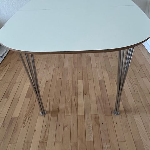 Lækkert spise bord uden stole. Enkelte brugsspor. Plads til 6 stole. Med plader kan de sidde 12 omkring. Kan skilles af til trandsport