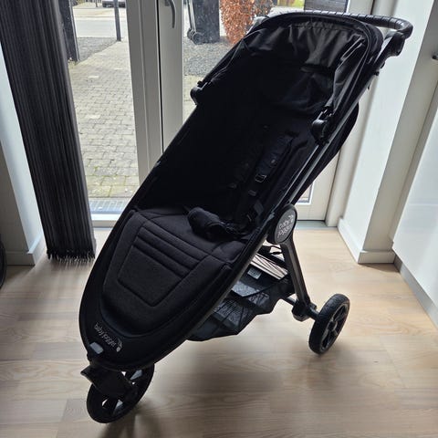 Superfin klapvogn i mørkegrå med masser af udstyr: kopholder, styrtaske, indkøbsnet, bord, myggenet og regnslag.