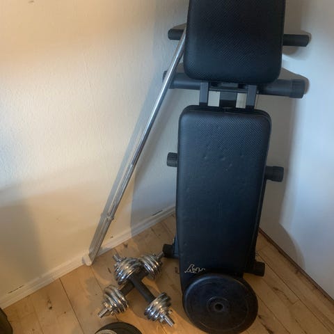 Super god stand. Bænk med 50kg vægtsæt - både lang stang og til håndvægte.