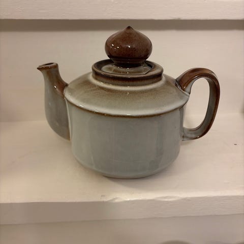Sælger endnu en skøn tekande fra Søholm i serien "Sonja". Denne kande har et særligt flot farvespil i den gråblå glasur, som gør hver del unik. Den har den klassiske mørkebrune kant og det ikoniske låg.