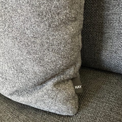 Hay pyntepuder i grå tekstil. Rektangulær pude med knapdetalje på forsiden og Hay-mærke i kanten. Velegnet som pyntepude til sofa, stol eller seng i stuen eller soveværelset. 45x60cm. Fejler intet. Fra ikke-ryger hjem. Prisen er samlet for begge puder.
